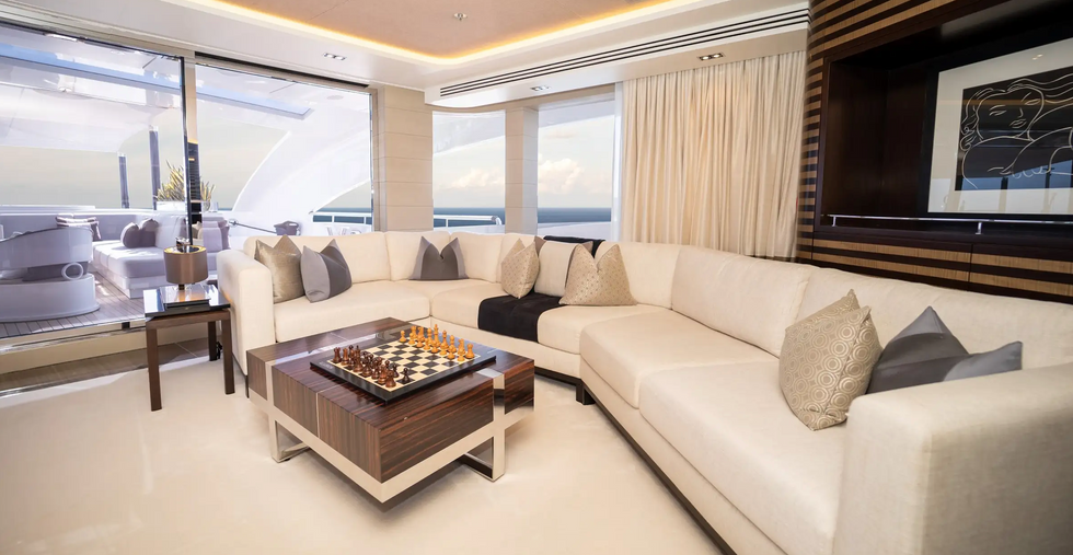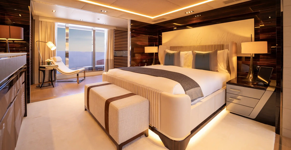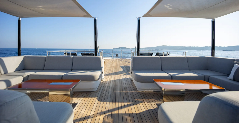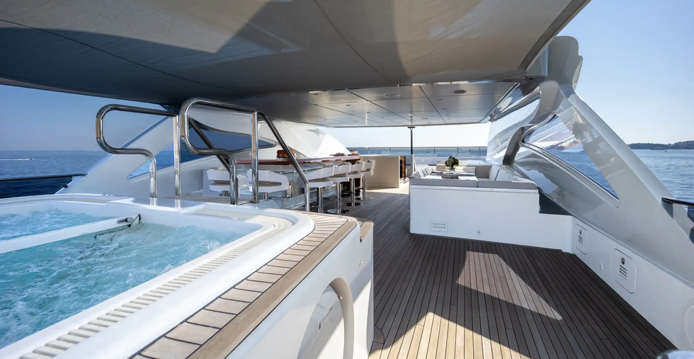 ILLUSION’s sun deck is a haven of leisure, spanning an impressive 106sqm (1,141sqft) and designed to captivate. Guests can unwind in two distinct lounge areas—one bathed in sunlight, the other shaded—or gather at the fully equipped sit-up bar, perfect for crafting sunset cocktails. The deck’s crowning jewel is a sprawling Jacuzzi flanked by sun pads, all sheltered by wraparound tinted windscreens that ensure comfort even on breezy days.